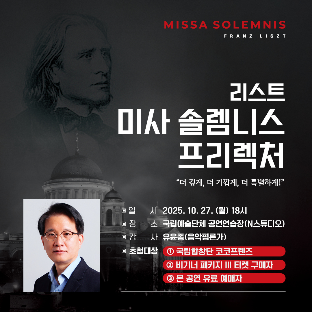 ㅣ<미사 솔렘니스> 사전강의 (10/27)ㅣ 유료회원 '코코프렌즈' 또는 패키지 티켓 구매자, 본 공연 유료 예매자를 위한 아주 특별한 혜택, 깊이 있는 해설과 작품에 담긴 고유한 감동을 미리 만나보세요! 행사명 : 국립합창단 제204회 정기연주회 낭만주의 거장의 합창음악 IV <미사 솔렘니스> 프리렉처 일 시 : 2025. 10. 27.(월) 18시(약 90분) 장 소 : 국립예술단체 공연연습장(N스튜디오) 강 의 : 유윤종(음악평론가) 대 상 : 국립합창단 코코프렌즈, 비기너 패키지 구매 고객, 본 공연 유료 예매자 신청 기한 : 2025. 10. 23.(목)까지 ※신청 링크: https://forms.gle/TvQsCEnG9p9yKLcM6 |