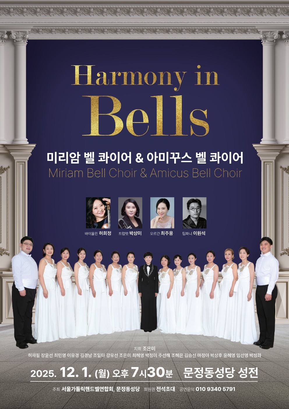 서울가톨릭핸드벨 연합회 소속 단체인 '미리암 벨 콰이어 제25회'와 '아미꾸스 벨 콰이어 제12회'의 연합 연주회 'Harmony in Bells' 에 여러분을 초대합니다.