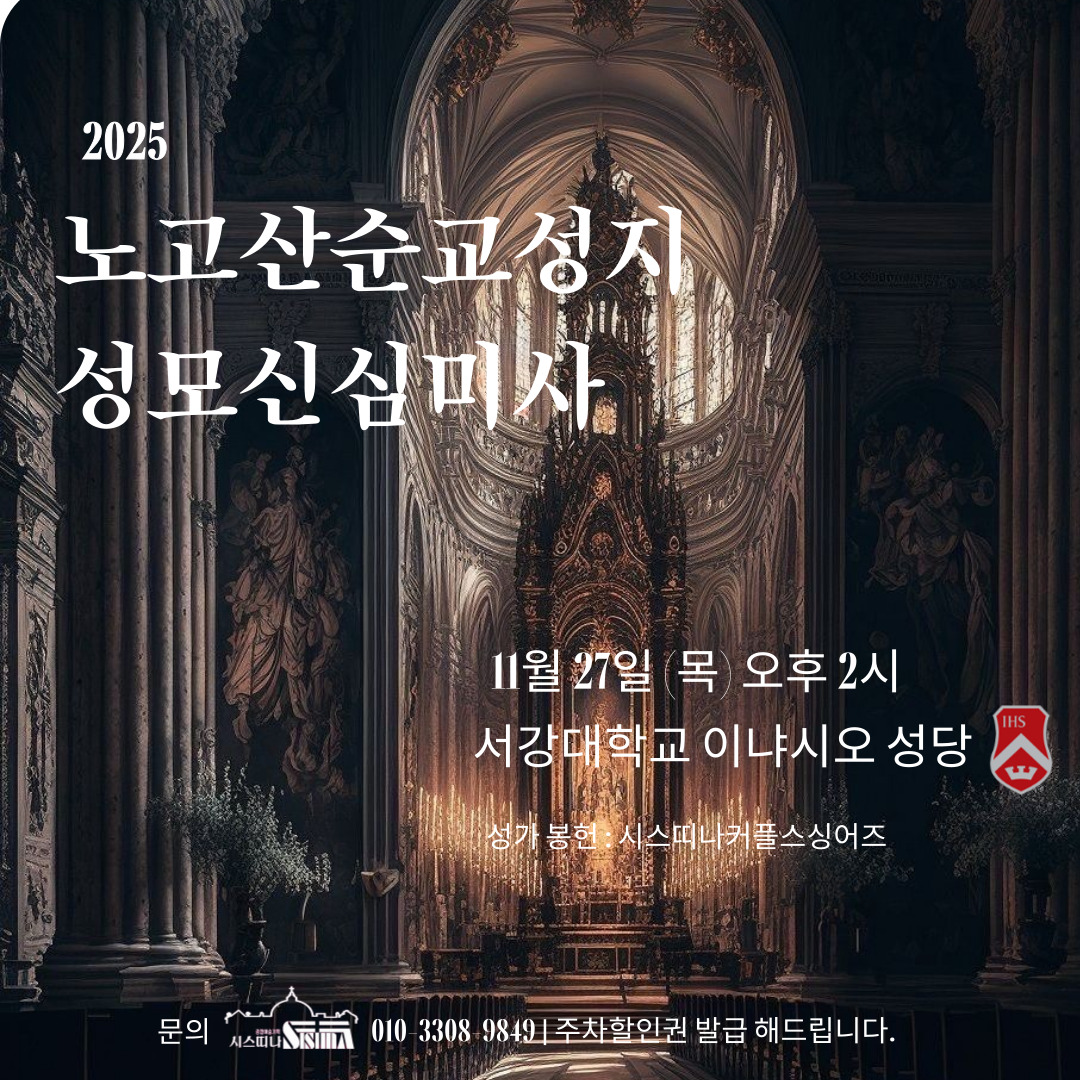 25년 11월 위령성월을 지내며 11월 노고산 순교성지 성모신심미사가 그리스도왕대축일 이후 전례력으로 마지막 주간인 연중 제34주간 목요일인 11월27일에 서강대학교 내 성 이냐시오 대성당에서 봉헌됩니다