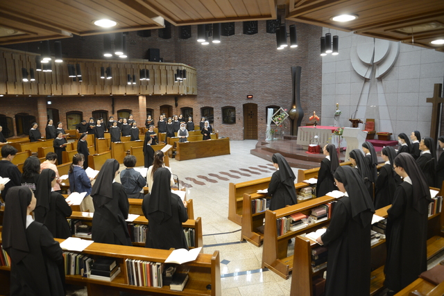 시간전례를 바치고 있는 툿찡 포교 베네딕도수녀회 대구 수녀원 수도자들. 100년 전인 1925년 한국에 진출한 수녀회는 수도승이자 선교사로서 온갖 고난과 박해에도 아랑곳하지 않고 이 땅에 복음을 선포하고 있다. 툿찡 포교 베네딕도 수녀회 대구 수녀원 제공