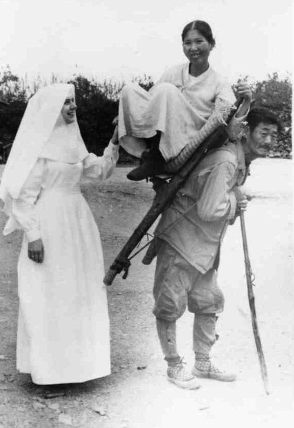 - 1960년대 대구 신암동 툿찡 포교 베네딕도수녀회 무료진료소에서 환자를 지게로 이송하는 모습. 툿찡 포교 베네딕도 수녀회 대구 수녀원 제공