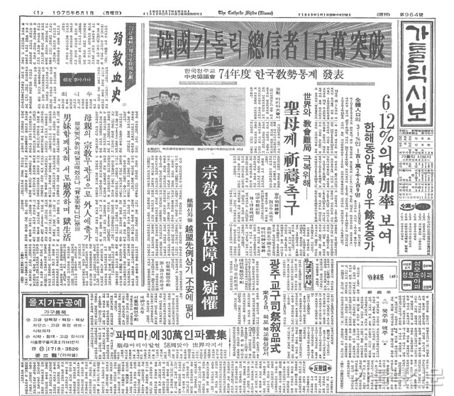 - 가톨릭시보 1975년 6월 1일자 1면에는 ‘한국 가톨릭 총 신자 1백만 돌파’라는 제목의 기사가 게재됐다. 가톨릭신문 자료사진