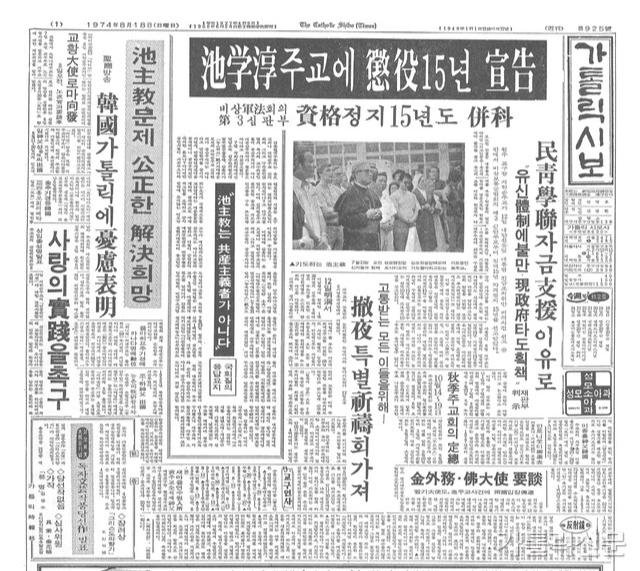 - 가톨릭시보 1974년 8월 18일자 1면에는 ‘원주 지학순 주교 징역 15년 선고’라는 제목의 기사가 게재됐다. 가톨릭신문 자료사진