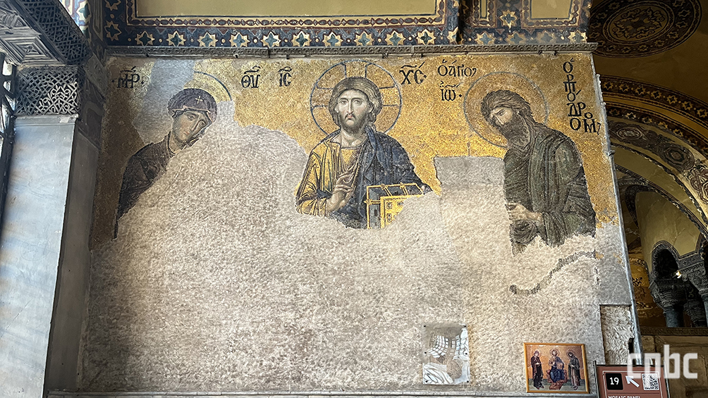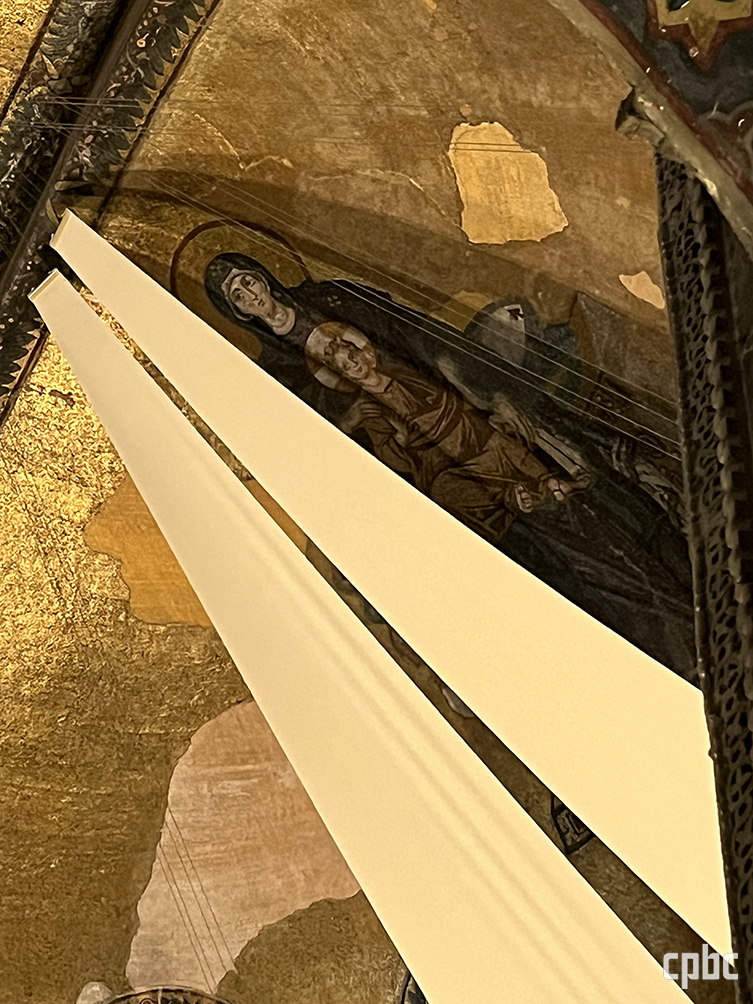 성당 내부를 좀더 자세히 들여다 보면 중앙 돔 아래 귀퉁이에 세라핌이 그려져 있는 것을 확인할 수 있다.(사진3 참조) 과거 제단 위인 돔 안쪽에는 성모님과 아기 예수님의 모습도 있다.(사진4 참조) 성상 파괴가 한창이던 9세기에 제작된 모자이크화인데, 지금은 천으로 가려졌다.