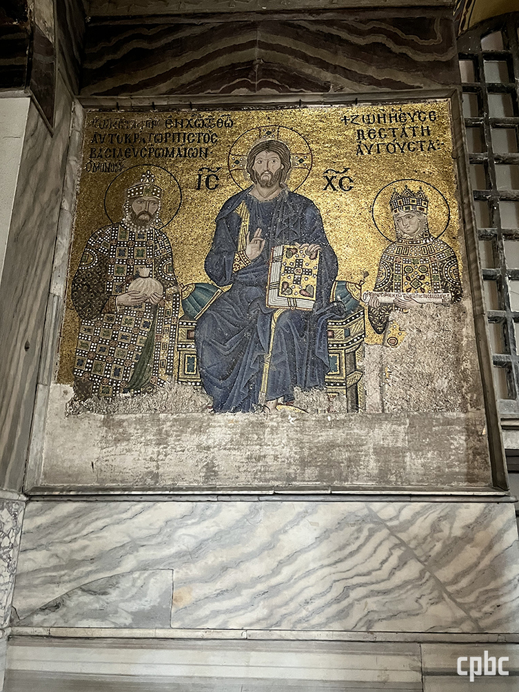 푸른 옷을 입은 예수님 양쪽으로 콘스탄티누스 9세와 조에 황후의 모습을 담은 작품도 있다. 예수님은 왼손에 성경을 들고, 오른손을 들어 축복하고 있다. 얼굴 뒤로 십자가형 후광이 비치고, 그 좌우로 예수 그리스도를 뜻하는 그리스어 약자 IC와 XC가 새겨져 있다..(사진2 참조)