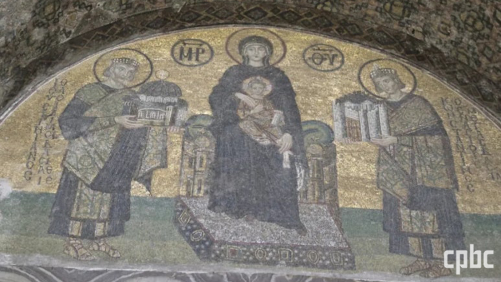 - 성모자를 중심으로 왼쪽에는 유스티니아누스 1세가 성 소피아 성당을, 오른쪽에는 콘스탄티누스 대제가 콘스탄티노폴리스를 상징하는 건축물을 들고 있다.