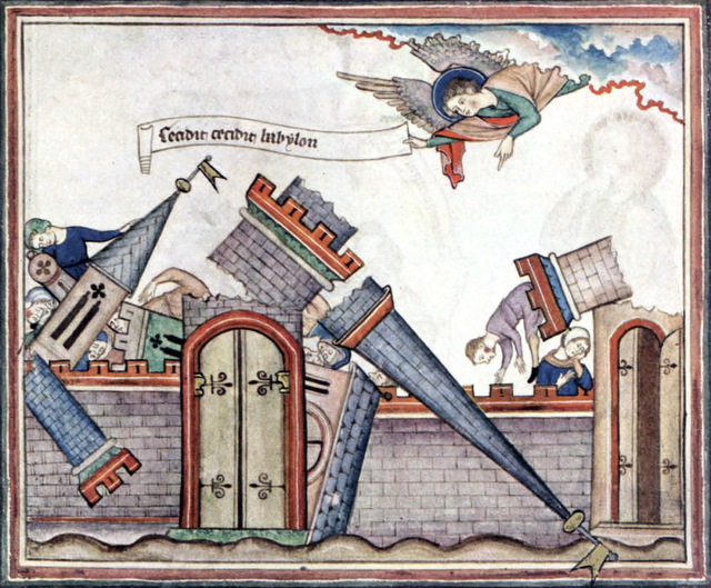 - 14세기 초 프랑스에서 제작된 요한 묵시록 필사본 「클로이스터스 묵시록」의 삽화 중 <두 번째 천사와 바빌론의 패망>. 출처 위키미디어
