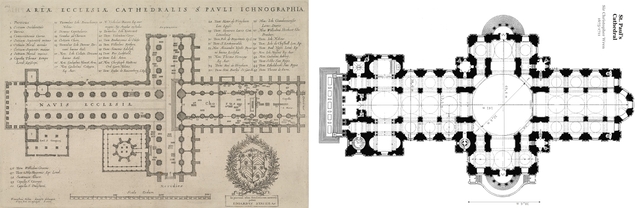 - (왼쪽부터)웬체슬라우스 홀라르가 설계한 성 바오로 대성당 평면도(1658년)와 1666년 대화재로 인한 소실로 크리스토퍼 렌 경이 재설계한 성 바오로 대성당 평면도. 출처 위키미디어