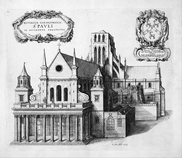 구(舊) 성 바오로 대성당은 1087년에 화재로 소실되었다가 로마네스크 양식과 초기 영국 고딕 양식으로 2세기에 걸쳐 지어 1240년에 봉헌되었습니다. 이후 14세기에 증축하여 당대의 성당들 가운데 가장 긴 평면과 가장 높은 첨탑을 소유하게 되었습니다. 하지만 16세기 들어 건물은 구조적으로 불안정했고, 종교개혁으로 성당 내부가 파괴되기도 했으며, 1561년에는 낙뢰로 첨탑에 불이 붙어 무너져 내렸습니다. 이에 제임스 1세는 런던의 주교좌 성당인 성 바오로 대성당을 보수하고 개축하여 영국 국교회의 종교개혁에 대한 의지를 세상에 알리고자 하였습니다.