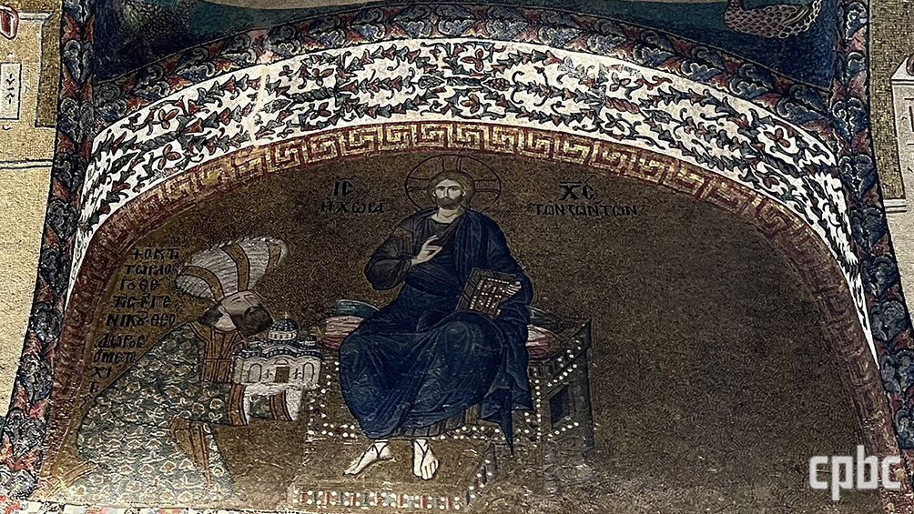 4. 왼손에 성경을 들고 오른손으로 축복하는 그리스도의 모습을 담은 전형적인 판토크라토르. 그 위로 카나의 혼인 잔치에서의 기적(왼쪽)과 오병이어의 기적(오른쪽)을 표현한 모자이크가 펼쳐진다.