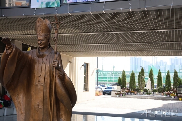 - 배곧성당 입구에는 주보성인 성 요한 바오로 2세 교황 동상이 방문자를 맞는다. 동상 뒤로는 성모 동산이 자리하고 있다. 변경미 기자