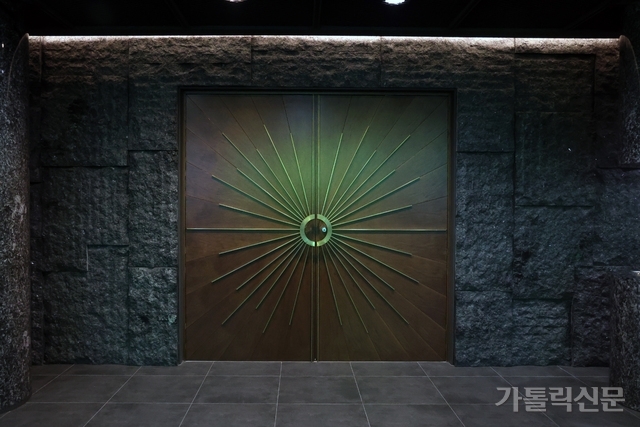 - 전체적으로 어두운 분위기를 내는 성전 로비에 빛을 형상화한 성전문. 변경미 기자