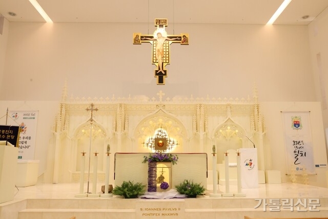 - 배곧성당의 제대 뒤편에는 ‘초막’을 모티브한 제단벽 부조가 설치돼 있고, 앞에는 주보성인 성 요한 바오로 2세 교황의 유해가 모셔져 있다. 변경미 기자