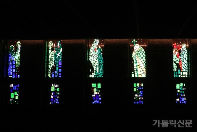 - 성전 양쪽 벽면에 설치된 파노라마 형태의 유리화는 제대에 가까워질수록 하얀 빛을 낸다. 변경미 기자