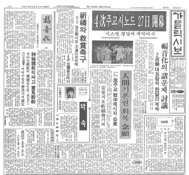 - ‘인간 기본권 회복 염원’이라는 제목으로 게재된 가톨릭시보 1974년 9월 22일자 1면. 가톨릭신문 자료사진사제들의 시국선언