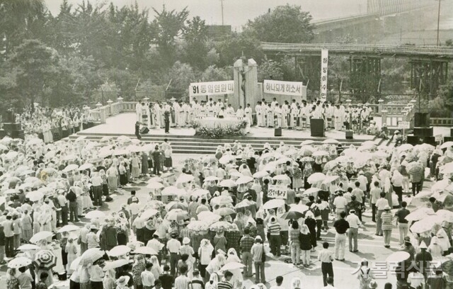 - 지학순 주교 구속 후 결성된 정의구현사제단은 이후 한국교회의 민주화 운동에서 구심점 역할을 했다. 정의구현사제단이 1991년 8월 16일 임진각에서 민족의 화해와 일치를 위한 「91통일염원미사」를 봉헌하는 모습. 가톨릭신문 자료사진공의회가 가르친 사회참여
