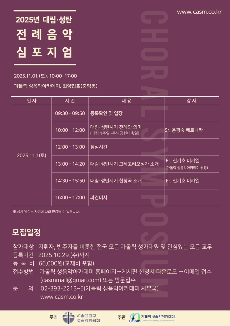 - 접수방법 : 가톨릭 성음악아카데미 홈페이지 → 게시판 신청서 다운로드 → 이메일 접수 (메일주소: casmmail@gmail.com)