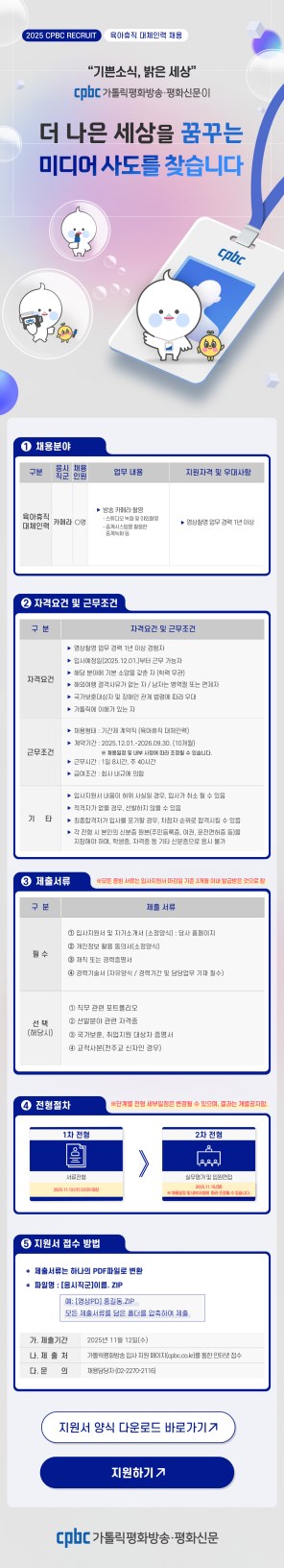 입사 지원 : https://program.cpbc.co.kr/tv/recruit/board/4328946?cmd=view&page=1&board_no=163