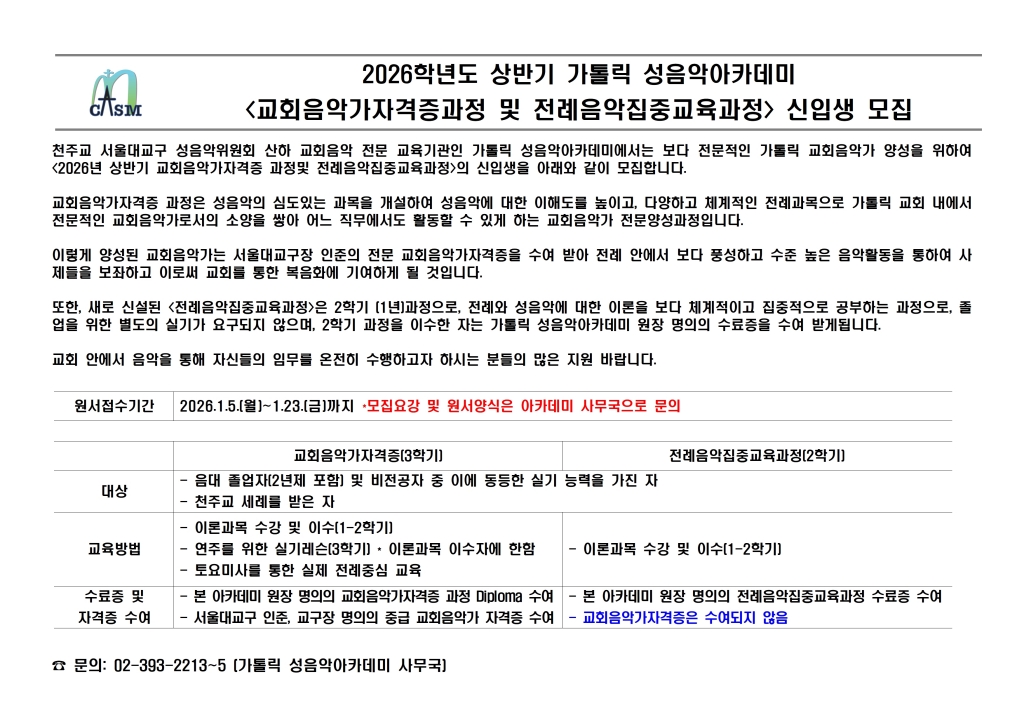 [가톨릭 성음악아카데미] 2026학년도 상반기 <교회음악가자격증 과정 및 전례음악집중교육과정> 신입생 모집