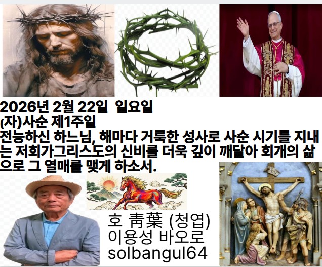 2026년 2월 22일 일요일 (자) 사순 제 1주일 오늘은 사순 제1주일입니다. 원조들의 불순종으로 세상에 죄와 죽음이 들어왔지만 예수 그리스도를 통하여 구원이 이루어졌습니다. 주님께서 주신 이 생명의 은총이 우리 안에 있음을 깨달아야 하겠습니다. 이 거룩한 미사에 참여하며 죄를 멀리하는 새로운 삶을 다짐합시다.