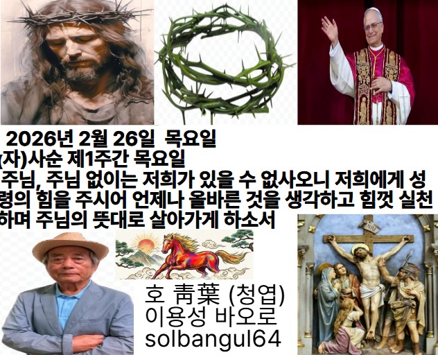 2026년 2월 26일 목요일 (자) 사순제 1주간 목요일 주님, 제 말씀에 귀를 기울이소서. 제 탄식을 들어 주소서. 저의 임금님, 저의 하느님, 제 기도 소리 귀여겨들으소서.