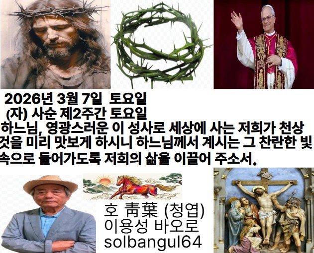 2026년 3월 7일 토요일 (자) 사순 제2주간 토요일 주님은 너그럽고 자비하시며, 분노에 더디시고 자애가 넘치시네. 주님은 모두에게 좋으시며, 그 자비 모든 조물 위에 내리시네.