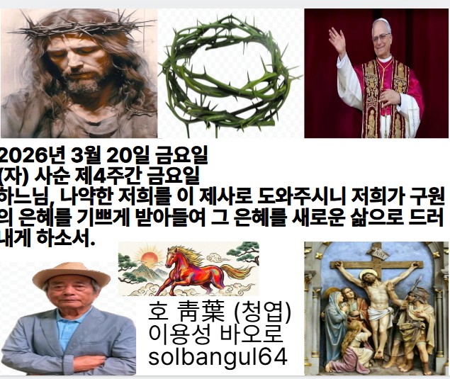 2026년 3월 20일 금요일 (자) 사순 제4주간 금요일 하느님, 당신 이름으로 저를 구하시고, 당신 권능으로 제 자유를 찾아 주소서. 하느님, 제 기도를 들으시고 제 입이 아뢰는 말씀에 귀를 기울이소서.