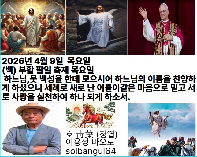 2026년 4월 9일 목요일 (백) 부활 팔일 축제 목요일 주님, 승리하신 당신 손을 한마음으로 찬양하나이다. 지혜는 말못하는 이들의 입을 열어 주고, 아기들의 혀도 또렷이 말하게 하였나이다. 알렐루야.