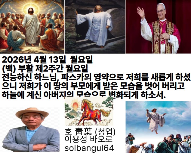 2026년 4월 13일 월요일 (백) 부활 제2주간 월요일 그리스도 죽은 이들 가운데에서 부활하시어 다시는 돌아가시지 않으리니, 이제는 죽음이 그분을 누르지 못하리라. 알렐루야.