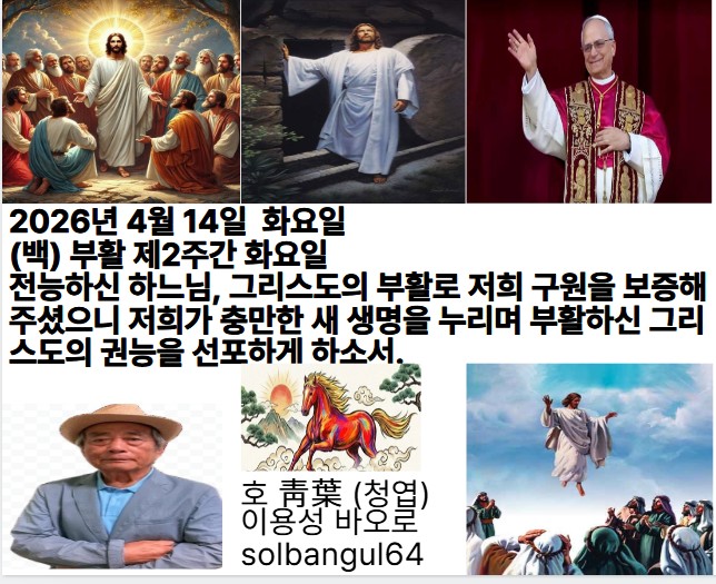 2026년 4월 14일 화요일 (백) 부활 제2주간 화요일 기뻐하고 즐거워하며 하느님께 영광 드리세. 주 우리 하느님, 전능하신 분이 다스리신다. 알렐루야.