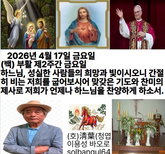 2026년 4월 17일 금요일 (백) 부활 제2주간 금요일 주님, 주님은 당신 피로 모든 종족과 언어와 백성과 민족 가운데에서 저희를 속량하시어, 하느님을 위하여 한 나라를 이루고 사제가 되게 하셨나이다. 알렐루야.