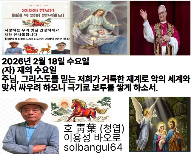 2026년 2월 18일 수요일 (자) 재의 수요일 오늘은 재의 수요일입니다. “사람아, 너는 먼지이니, 먼지로 돌아갈 것을 생각하여라.”라는 재의 예식 말씀을 묵상하며 주님께 간절히 청합시다. “저희가 모르고 죄를 지었을지라도 뉘우치며 살고자 하오니, 갑자기 죽음을 맞지 않게 하시고, 회개할 시간을 주소서.”