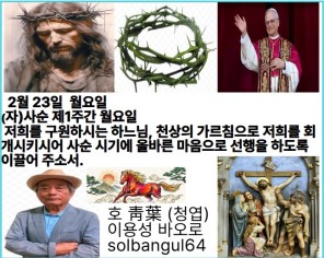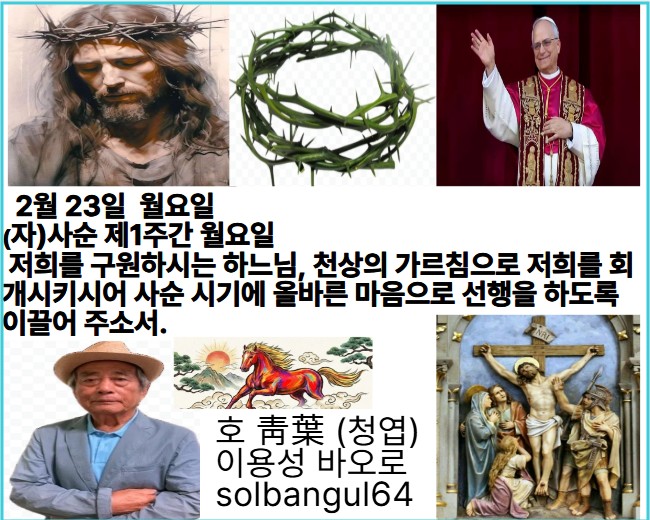 2026년 2월 23일 월요일 (자) 사순제 1주간 월요일 종들이 제 주인의 손을 눈여겨보듯, 저희는 주 하느님을 우러러보며 당신 자비만을 바라나이다. 자비를 베푸소서, 주님, 저희에게 자비를 베푸소서
