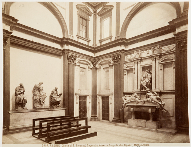 레오 10세 교황은 산 로렌초 성당 안에 그의 동생인 느무르 공작 줄리아노 데 메디치(1516년 사망)와 조카인 우르비노 공작 로렌초 데 메디치(1519년 사망)를 위한 메디치 경당(신 성구실)을 원했습니다. 1520년 이 경당은 브루넬레스키가 백 년 전에 만든 ‘구 성구실’을 기반으로 설계되었는데, 돔 천장을 가진 정사각형의 중앙집중형 공간과 세 개의 부속 공간으로 구성되었습니다.