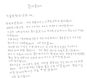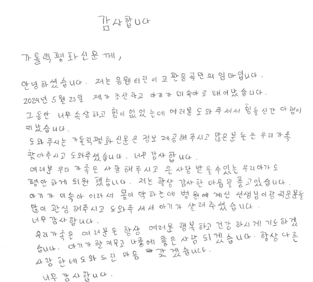 - ‘사랑이 피어나는 곳에’ 코너에 사연이 소개된 뒤 곡민군의 어머니 티린씨가 본지에 전해온 감사 편지.
