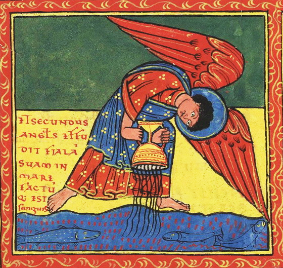 둘째 천사와 셋째 천사의 대접도 탈출기의 재앙과 엇비슷하다.(탈출 7,17-21 참조) 바다와 강이 핏빛으로 물드는 재앙은 물을 주관하는 천사를 통해 두 문장으로 요약된다.(묵시 16,5-6 참조) 주님께서는 의로우신 심판관이라는 것, 그리고 재앙이 마땅한 것은 성도들과 예언자들이 피를 쏟았기 때문이라는 것. 주석학자들은 요한 묵시록 16장 5절부터 6절까지의 이 말씀이 제단 아래 영혼들이 바랐던 ‘피의 복수’(묵시 6,10 참조)가 완전히 이루어졌다는 선언이라고 해석한다.
