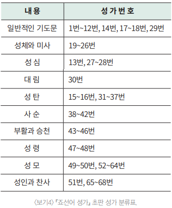 성가책의 구성을 보면, 앞부분에는 일반적인 기도문을 노래의 가사로 사용한 곡들을 다양하게 수록하였고, 이어 주제별로 비교적 일관성 있게 분류하여 배치(<보기4>)하였다.