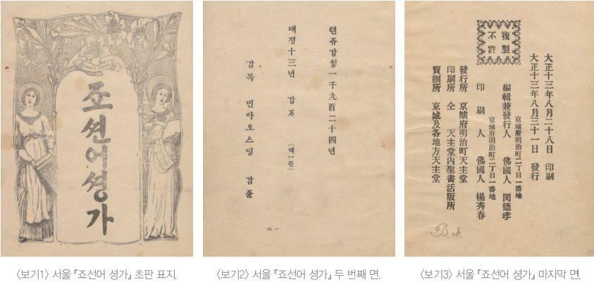 서울 『죠선어 셩가』 초판(<보기1>)은 1924년 서울에서 출판되었다. 『朝鮮語聖歌』 초판이 1923년 베네딕도 수도원에서 출판되었고 이 사실을 1928년의 재판 인준서를 통해서 명확히 확인할 수 있지만 현존하지 않기 때문에, 서울 『죠선어 셩가』 초판이 한국 천주교회에 현존하는 가장 오래된 성가책이다.