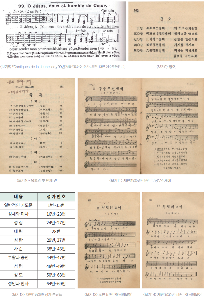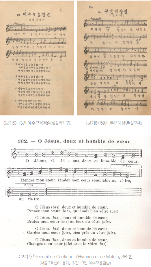 서울 『죠선어 셩가』 초판의 성가 68곡 중에서 52곡이 1911년에 출판된 『Recueil de Cantique d’Hymnes et de Motets』(찬미가와 모테트 성가 모음집)와 1912년에 출판된 『Cantiques de la Jeunesse』(청소년 성가)의 성가 선율을 사용하였다. 이 중에서 두 성가책에서 공통적인 곡(<보기7><보기8>)은 30곡이며, 『Recueil de Cantique d’Hymnes et de Motets』에서 15곡, 『Cantiques de la Jeunesse』에서 7곡이 각각 사용되었다.