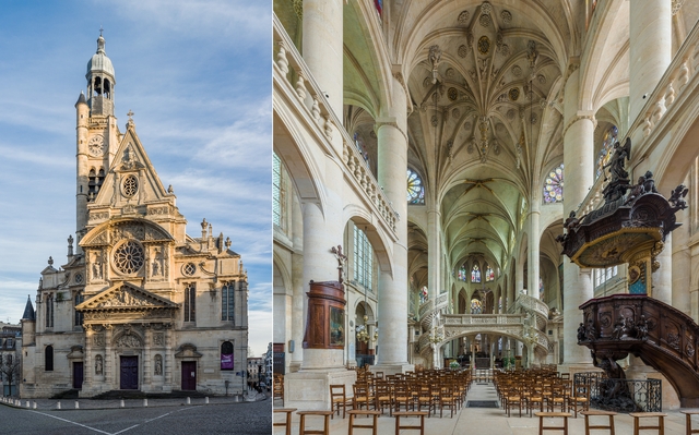 - 프랑스 파리 팡테옹 광장에서 바라본 생테티엔 뒤 몽 성당의 파사드(왼쪽)와 네이브 제단 방향. 출처 위키미디어
