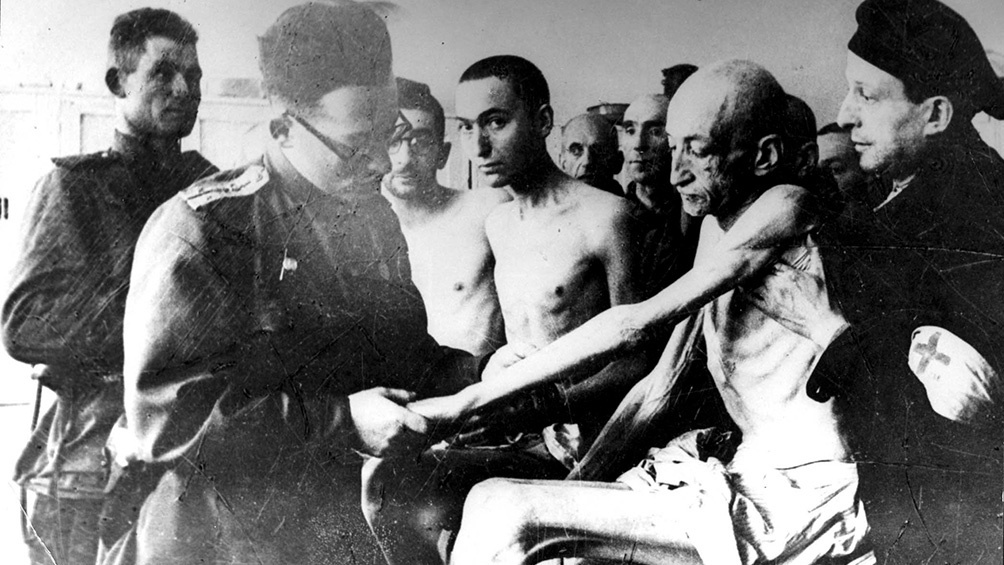 - 1945년 폴란드가 나치 독일로부터 해방된 이후 오시비엥침에 있는 아우슈비츠-비르케나우 나치 강제 수용소에서 소련 군의관이 홀로코스트 생존자들을 진찰하고 있다. OSV