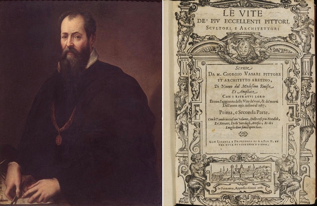 - (왼쪽부터) 자코포 추키(Jacopo Zucchi)의 <조르조 바사리 초상>과 바사리의 역서 「르네상스 미술가 평전」 1568년 개정판 1·2권 표지. 출처 위키미디어